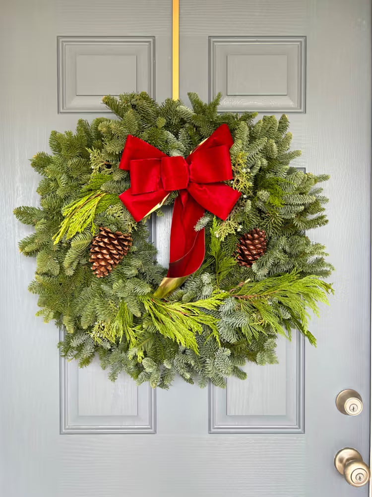 This handcrafted Christmas wreath captures the heart of the holidays with its lush, seasonal greenery and timeless design. Built from high-quality decorative foliage inspired by noble fir, cedar, and juniper, it brings that cozy, traditional Christmas feel to your home. Each wreath is finished with classic pinecone accents* and a soft velveteen bow, creating the warm holiday look everyone loves.
